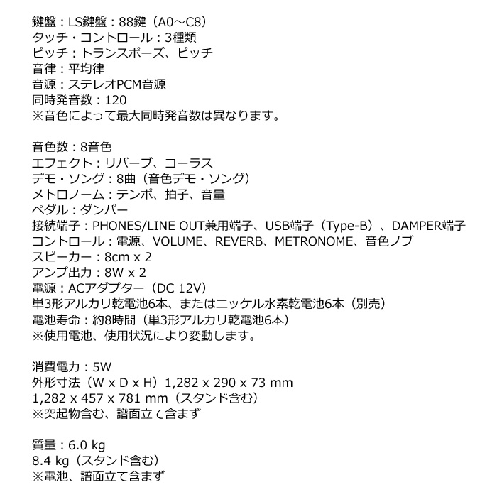 カラーはホワイトで、結婚式などでのご利用にもオススメです。ペダル・譜面立て・ACアダプターが付属します。88鍵のフルサイズ鍵盤を採用しながら130 cmを切る横幅、スピーカーを搭載しながら約7cmという薄さを実現。ピアノとして大事な部分はしっかりと押さえつつスリムなデザインを両立しています。