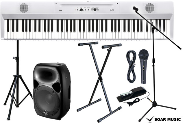 ピアノとボーカルのセットです!弾き語りやピアニストとボーカリストのユニットなどに。KORGの電子ピアノ(88鍵)と有線マイク、パワードスピーカーを一緒にした便利なセット。 スピーカーはボーカルと電子ピアノの音を同時に出力可能です。また、パワーも250W出力あり、広めの会場でも対応可能です。