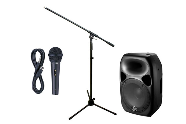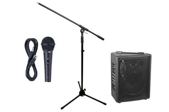 ボーカルや司会の方のための簡単お手軽セットです。スピーカーはアンプ内蔵・25W出力で、室内のちょっとしたイベントや小規模のスペース向きです。マイクをスピーカつつなぐだけの簡単接続ですぐに使えます。ご希望であればスピーカースタンドも無料でお貸しします。