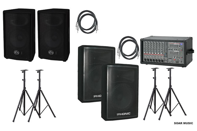 合計440Wのパワードミキサーを含む、さらに本格仕様のPAセット。メイン出力の他に、モニター用出力も装備。バランスマイクインプット・ラインインプット x7チャンネル装備。AUX IN装備。 比較的コンパクトながら広めの会場や野外にも対応できる便利なセットです。