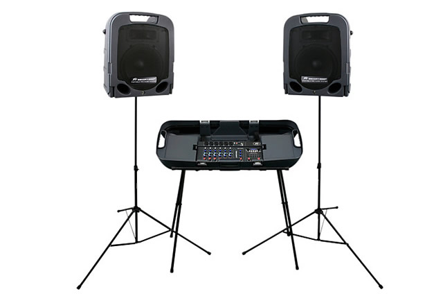 合計440Wのパワードミキサーにメインスピーカー x2台とモニタースピーカー x2台の合計4台のスピーカーをセット。実質800Wクラスの出力が可能です。メイン出力の他に、モニター用出力も装備で接続も簡単。バランスマイクインプット・ラインインプット x7チャンネル装備。AUX IN装備。 広い会場にも対応し、入出力も豊富な頼れるセットです。