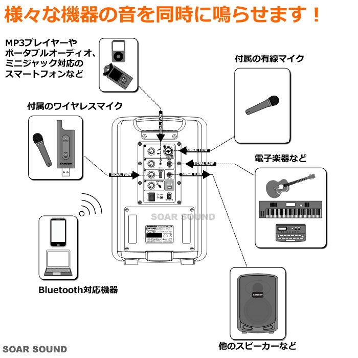 ミキサー部は1ch マイク入力+2ch ライン入力。電子ドラムやキーボードのモニターにも。CDや携帯型MP3プレイヤーなども接続可能。マイクを含めて合計3ch の入力が可能です。(※ ライン入力にステレオ信号を入力した場合、モノラルに変換します) スタンド立てにも対応し、イベントやパーティー用PA にも効果を発揮します。