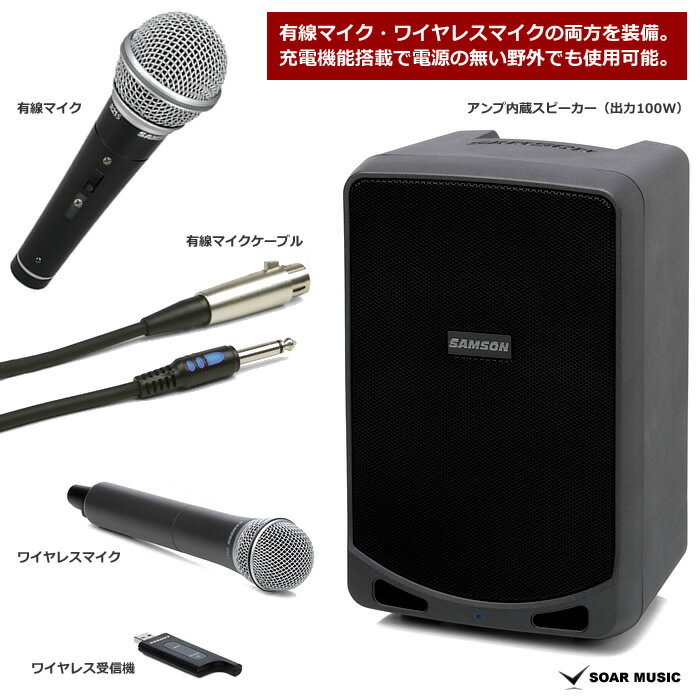 パワフルな100W出力。充電池内蔵なので、電源コンセントの無い環境でも使用可能です。(勿論、電源コンセント用のケーブルも付属します。)ワイヤレスマイク1本と有線マイク1本の合計2本が付属。フル充電で約20時間の連続使用が可能。(環境によって前後します。)Bluetooth入力装備。 参考イメージ