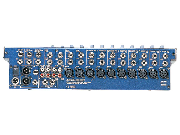 YAMAHAのアナログミキサー MG16/4 です。入力はモノラル×8+ステレオ×4の計16ch構成。入力端子のうちモノラル入力すべてにXLRとTRSフォーン、インサート端子を備えています。ステレオ入力はすべてフォーンで、1系統(ch9/10)にXLR、2系統(ch11/12、13/14)にRCAピンも搭載。そのほかAUXは2系統で、うち1系統はプリ/ポスト切り替えが可能。AUXリターンもステレオで1系統用意されています(モノ使用可)。EQはHIGH(10kHz)とLOW(100Hz)のシェルビングが2つ、MID(2.5kHz)のピーキング1つの計3バンド仕様のものが各々のチャンネルに装備され、ch1-12には80Hz以下をカットするハイパス・フィルターも搭載されています。
