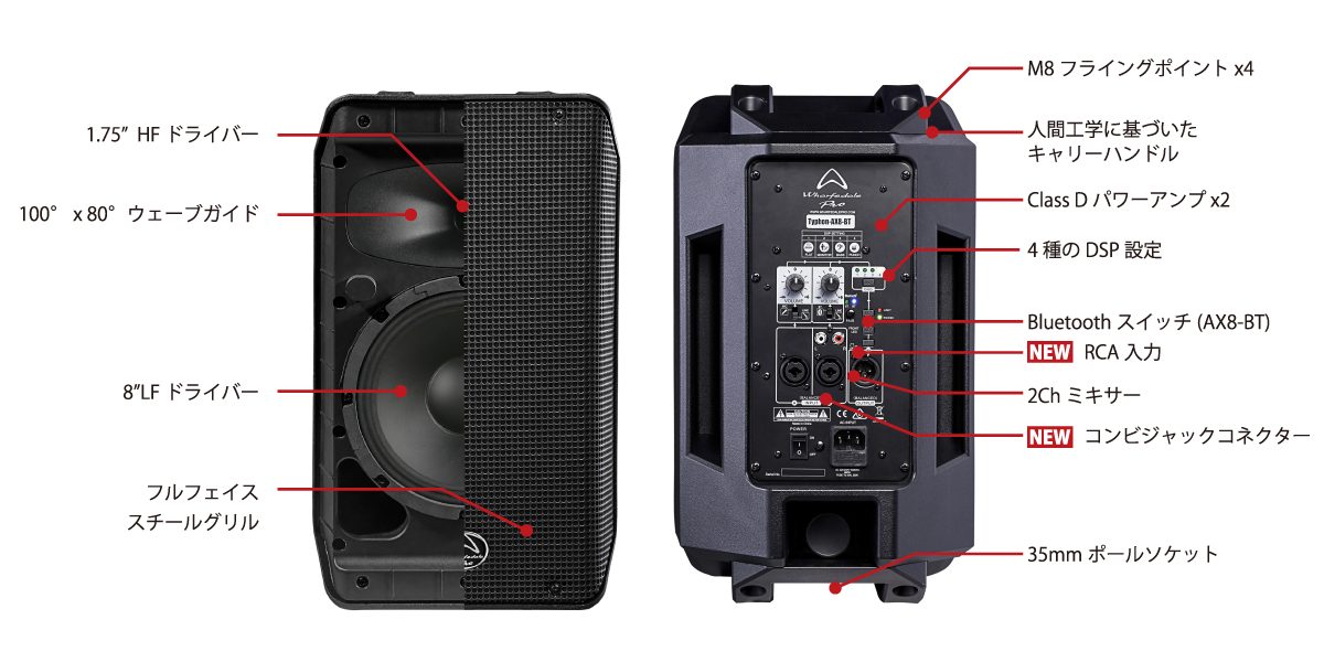 H509 x W326 x D310mmというコンパクトなサイズながら定格720Wピーク1440Wの出力を供給します。Bluetoothでスマホなどと接続して音楽を鳴らすことも可能。ステレオRCA入力が搭載され、外部音源と有線でも接続可能。XLR / 6.3mmジャックが使用可能なコンビジャックコネクターが両方の入力チャンネルに使用されています。頼れる1台。